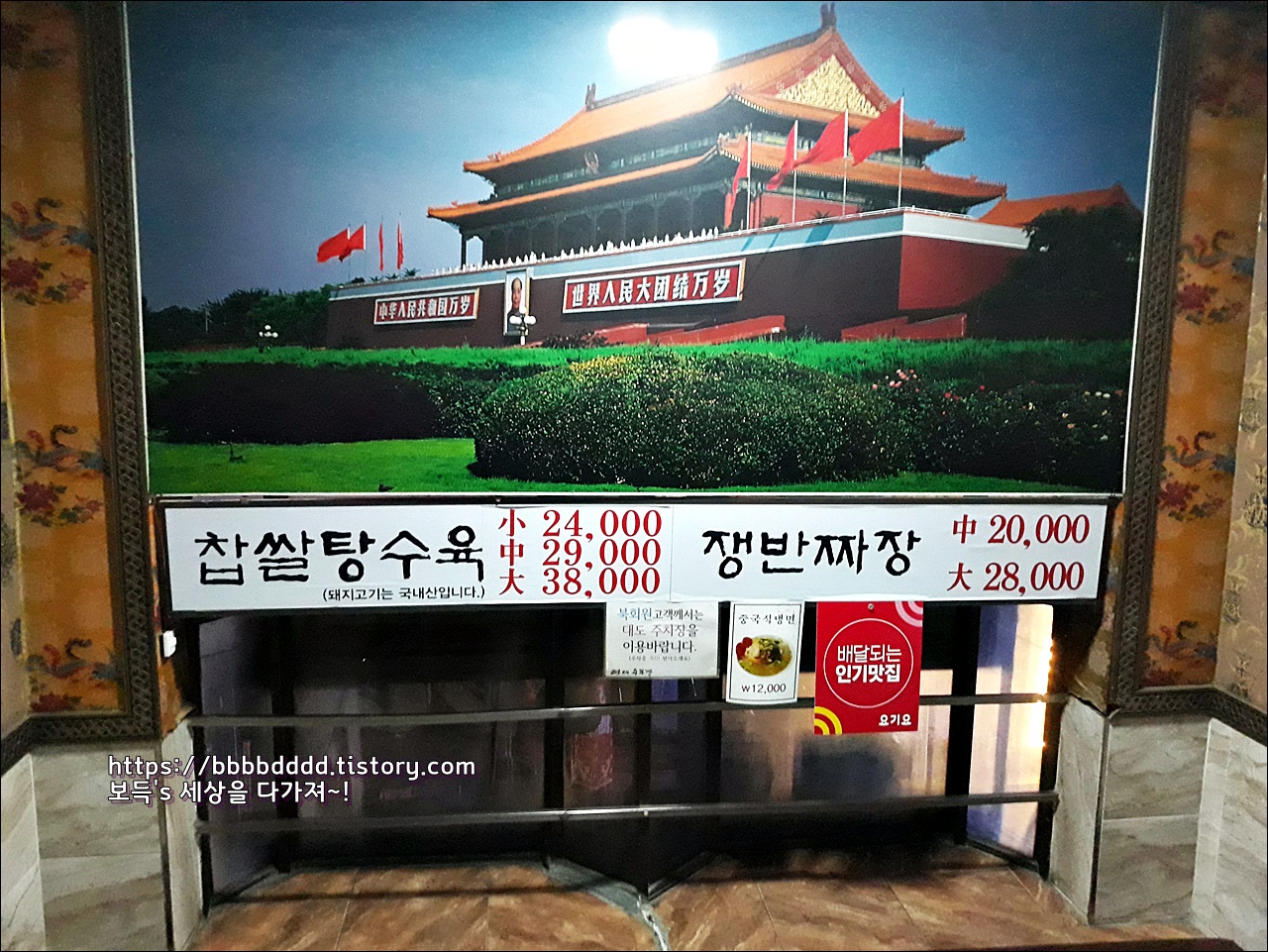 계단으로 올라가는 벽 쪽에는 천안문과 함께, 탕수육과 짜장 메뉴가 걸려 있다.