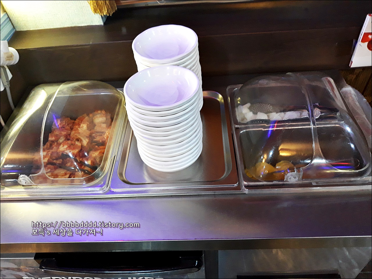 셀프코너에는 단무지, 김치, 양파와 그릇이 놓여져 있다.