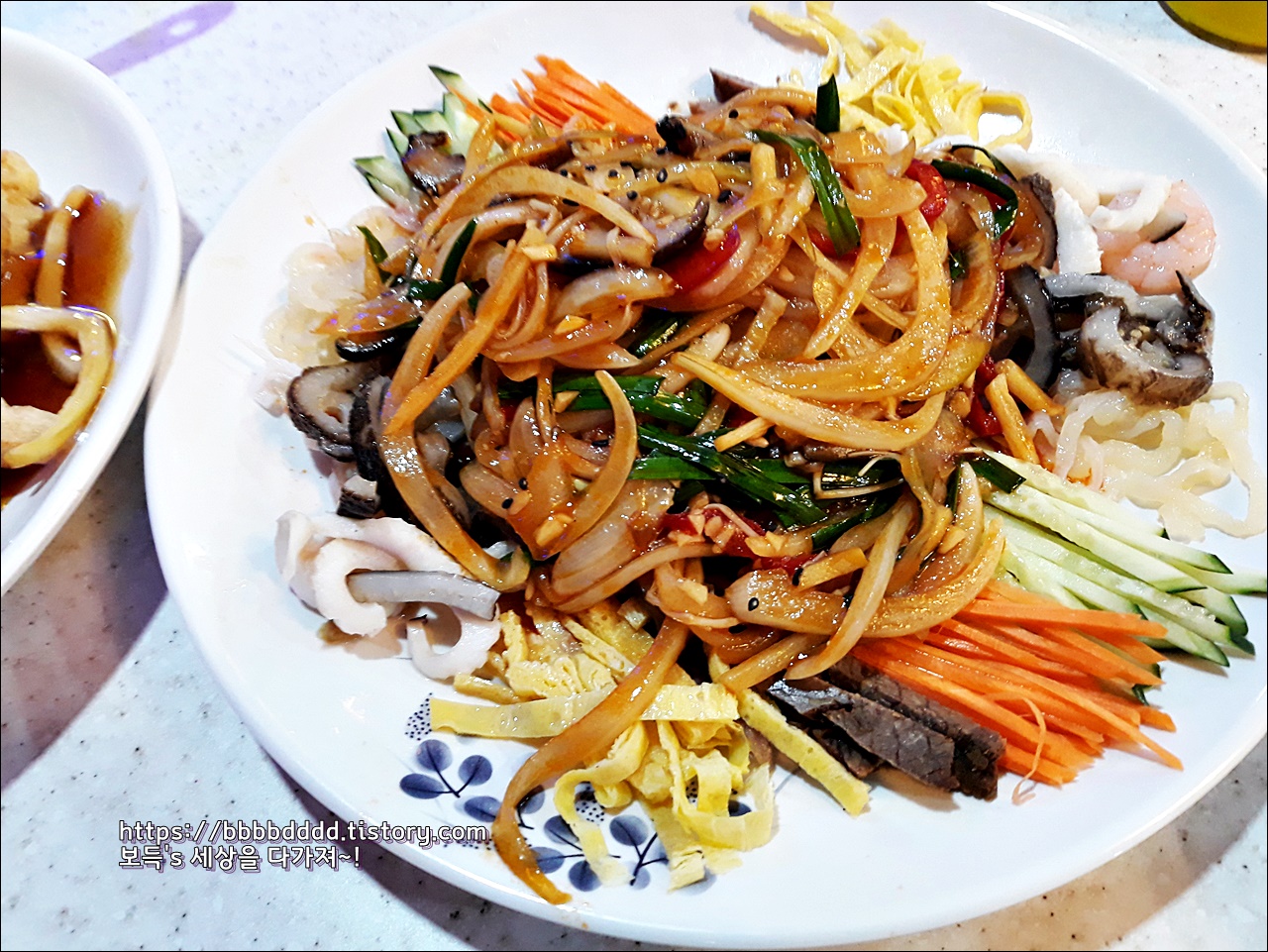 양장피에 겨자 소스를 부어, 사정없이 비빈다.