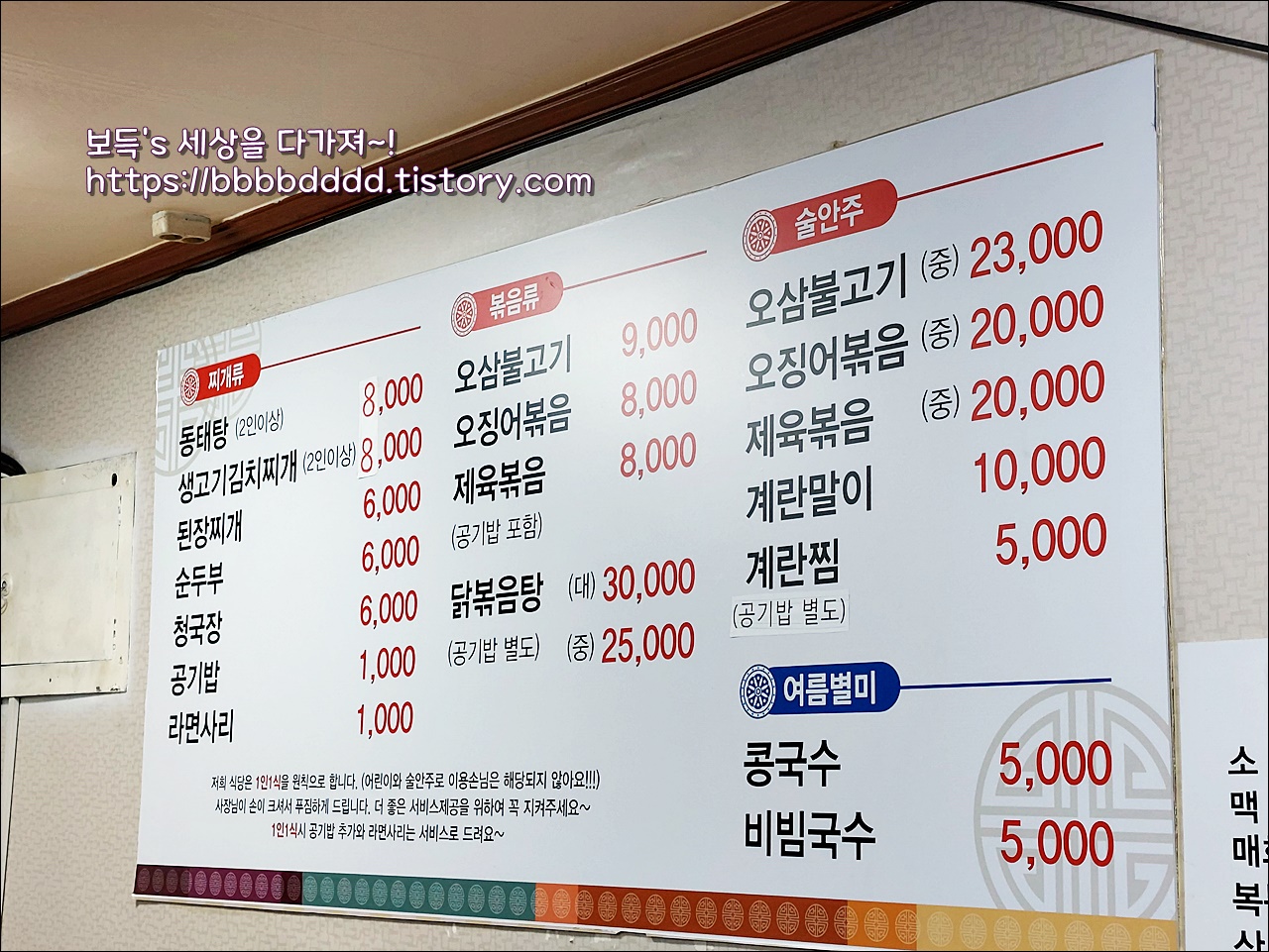 동태랑 김치랑의 메뉴다.