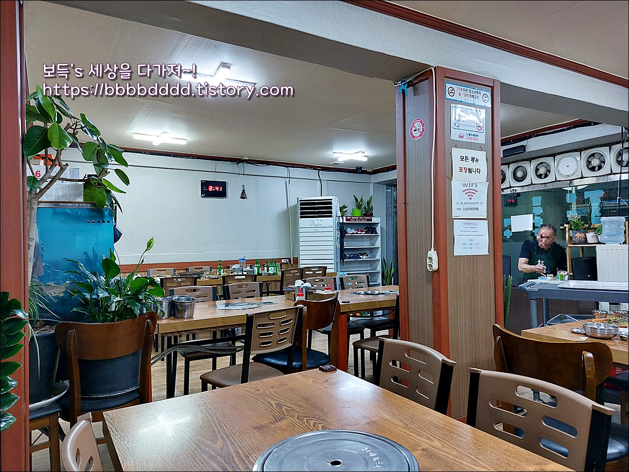 이곳에서 와이파이 가능하며, 모든 메뉴는 포장 가능하다.