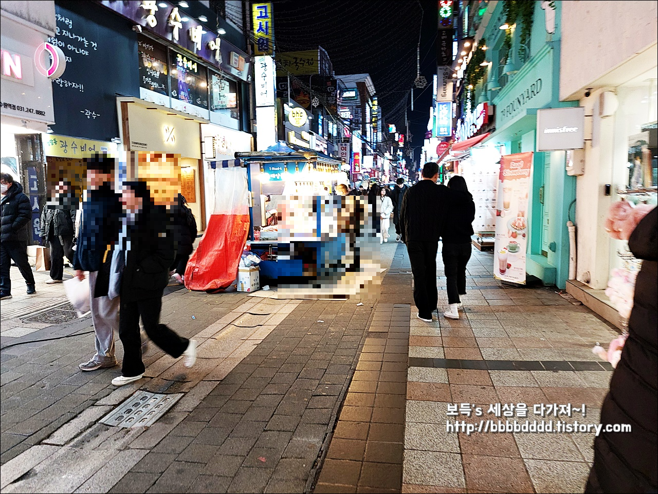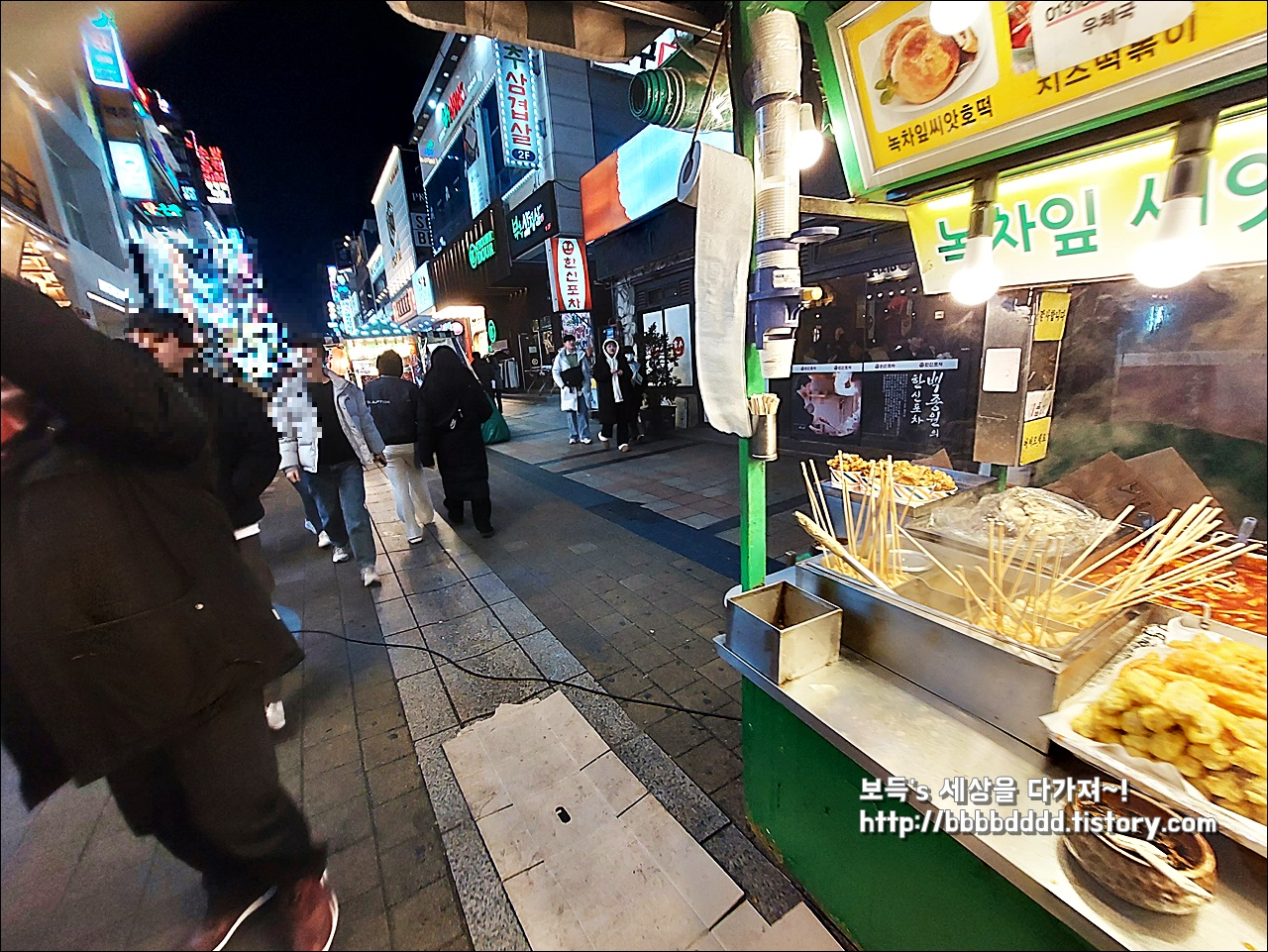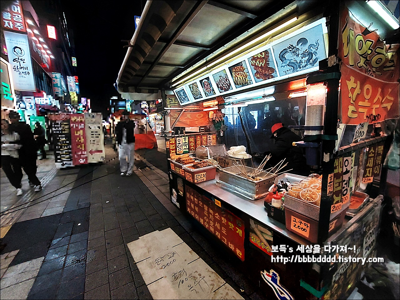 낮에 보이지 않는 포장마차가 거리의 중앙에 위치해 또 다른 먹거리를 제공한다.