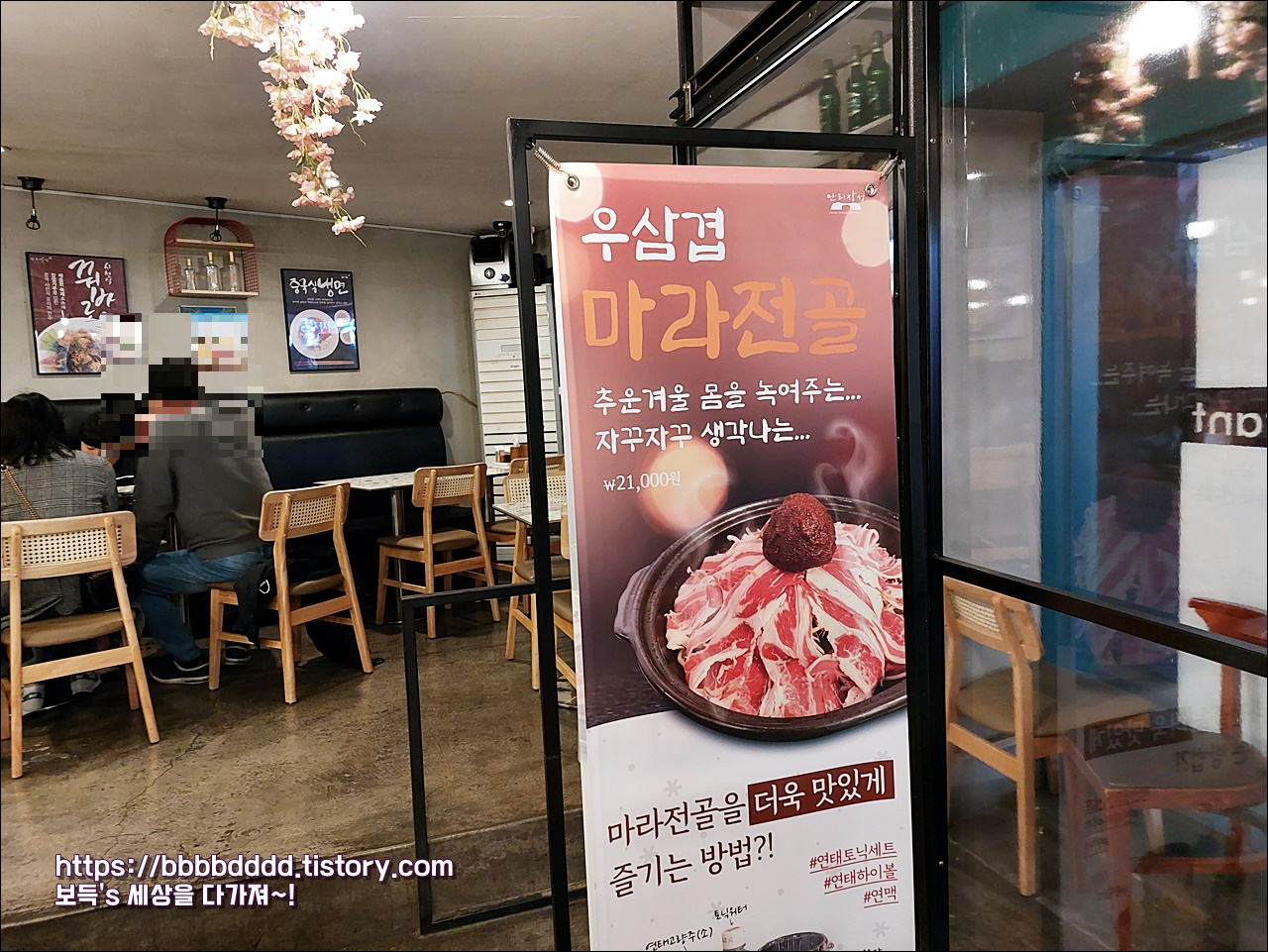 신메뉴 '우삼겹 마라전골'의 소개판이 출입구 쪽에 세워져 있다.