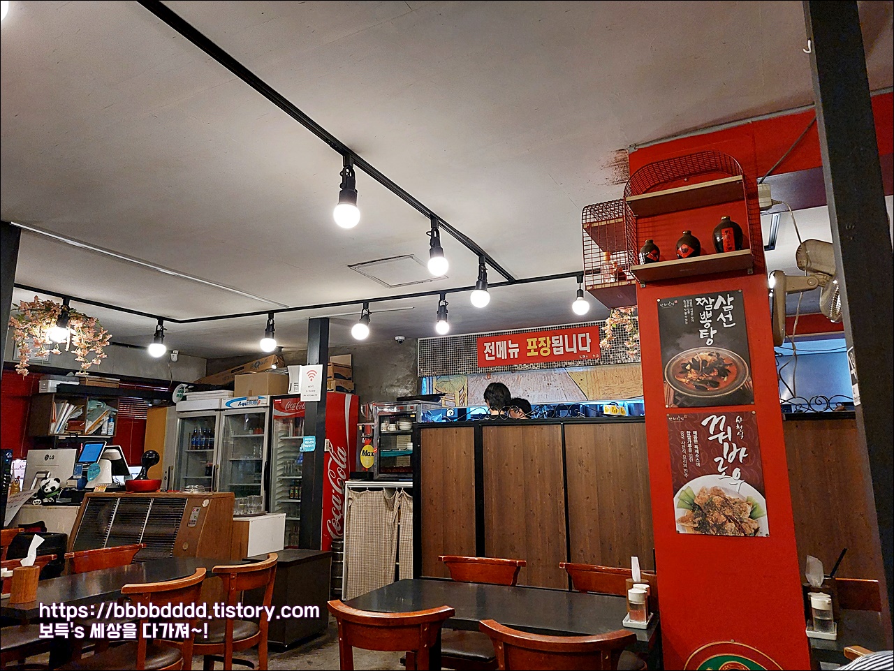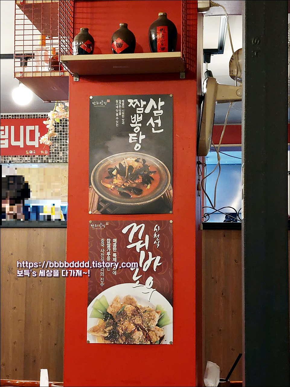 기둥에 붙여있는 메뉴 - 삼선짬뽕탕과 꿔바로우.