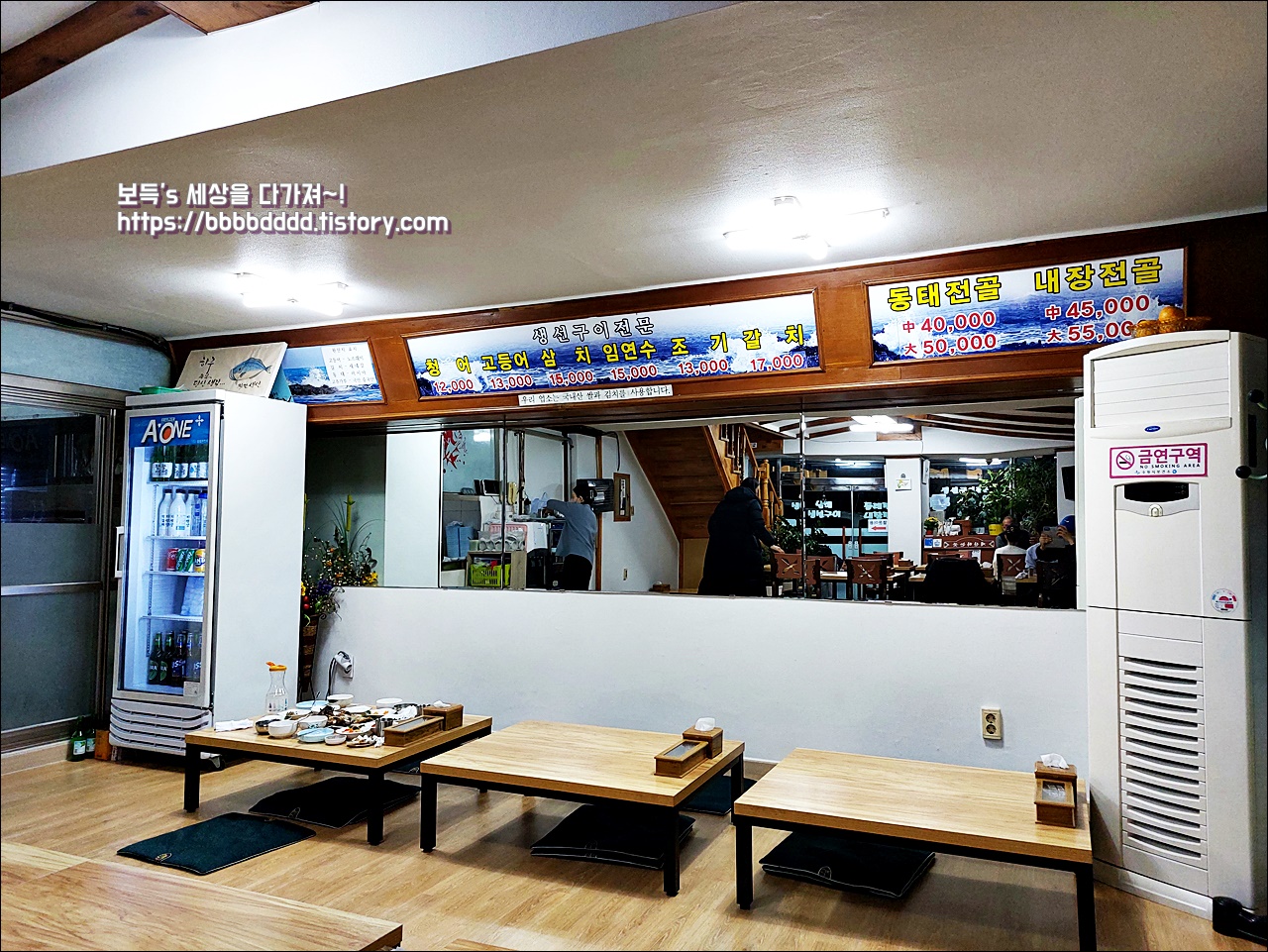 생선구이로는 청어, 고등어, 삼치, 임연수, 조기, 갈치가 있고, 전골로는 동태전골과 내장전골이 있다.