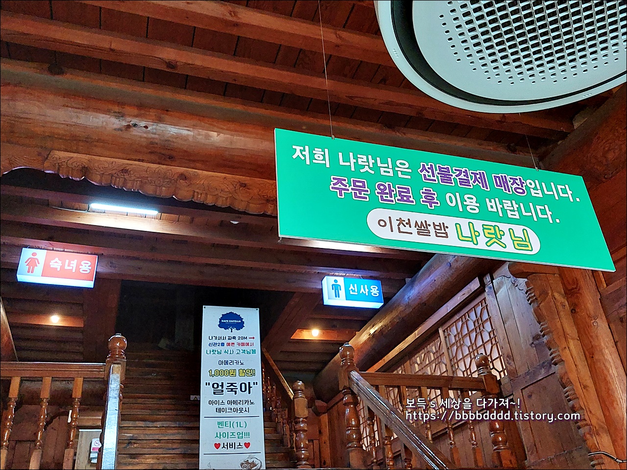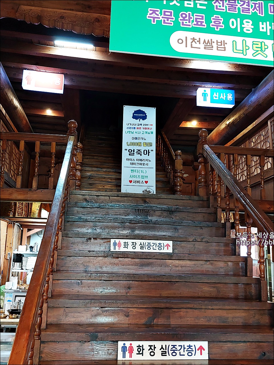 화장실은 출입구 부근 계단을 이용하여 2층으로 올라야 하는데, 연로하신 분들이 조금 불편해하신다.