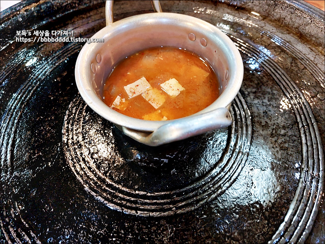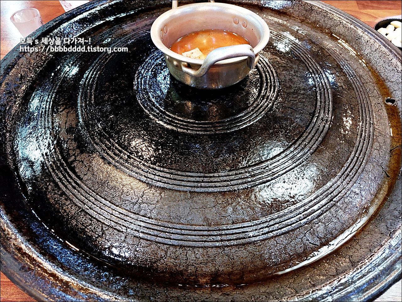 자그마한 김치찌개가 제일 먼저 솥뚜껑 위에 올려진다.