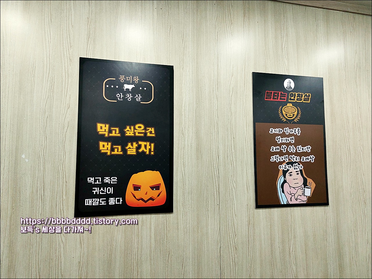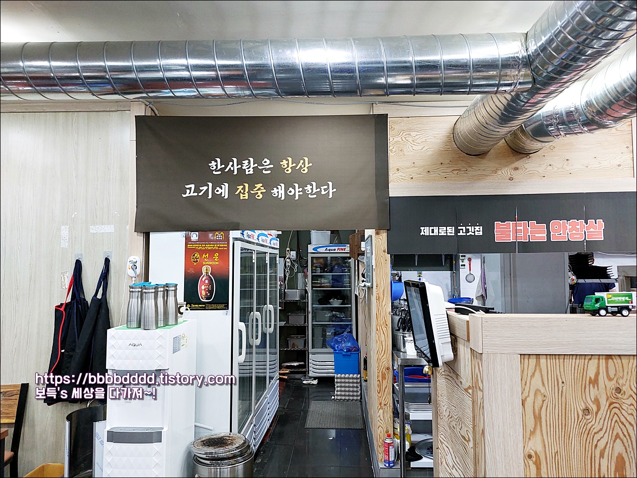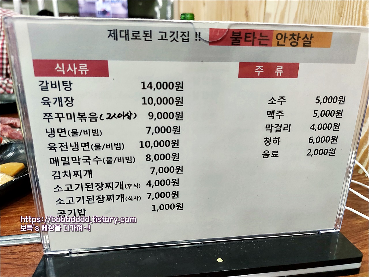 간판은 '제대로 된 고깃집 불타는 안창살'이라고 되어 있다.
