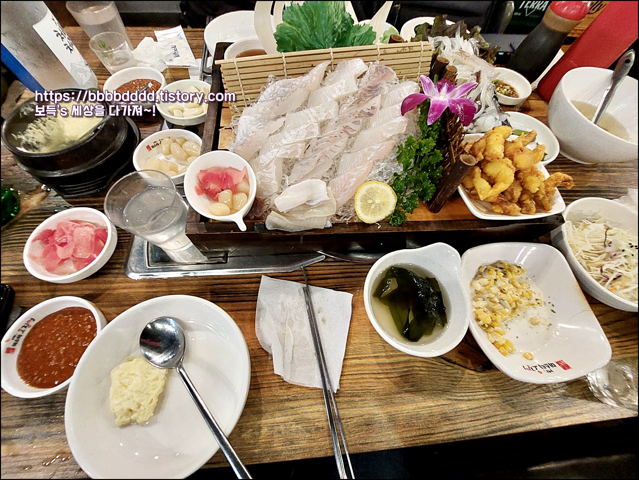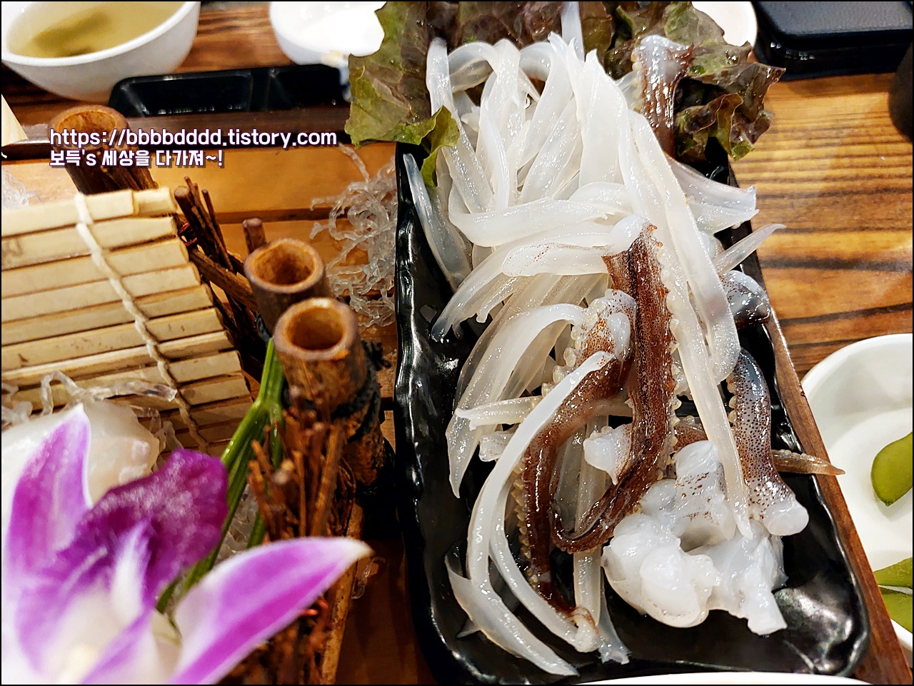 광어, 우럭과 함께 오징어회와 오징어튀김이 보인다.
