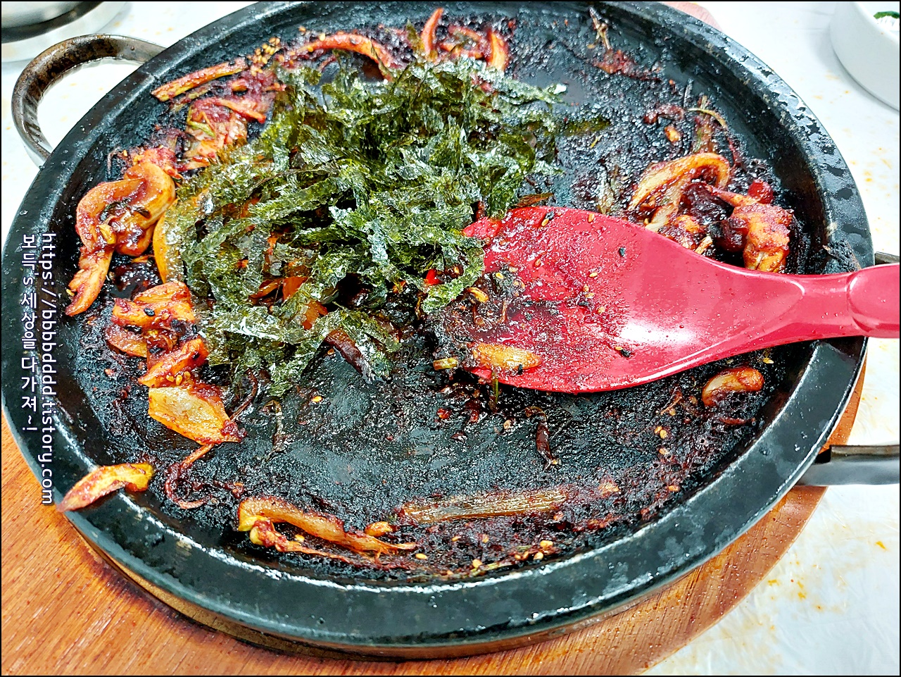 돌판에 조리가 되어 나오는데, 매콤하고 식재료도 신선한 듯하다.