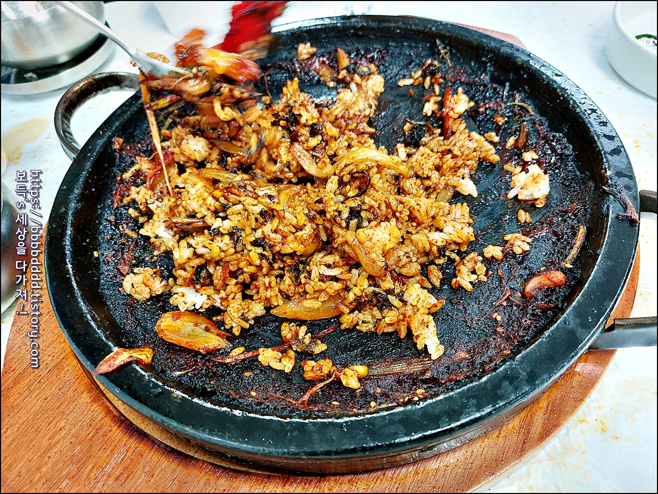 제대로 먹을 줄 아는 사람들은 돌판의 오징어볶음이 나오자마자 밥부터 비빈다고 한다.