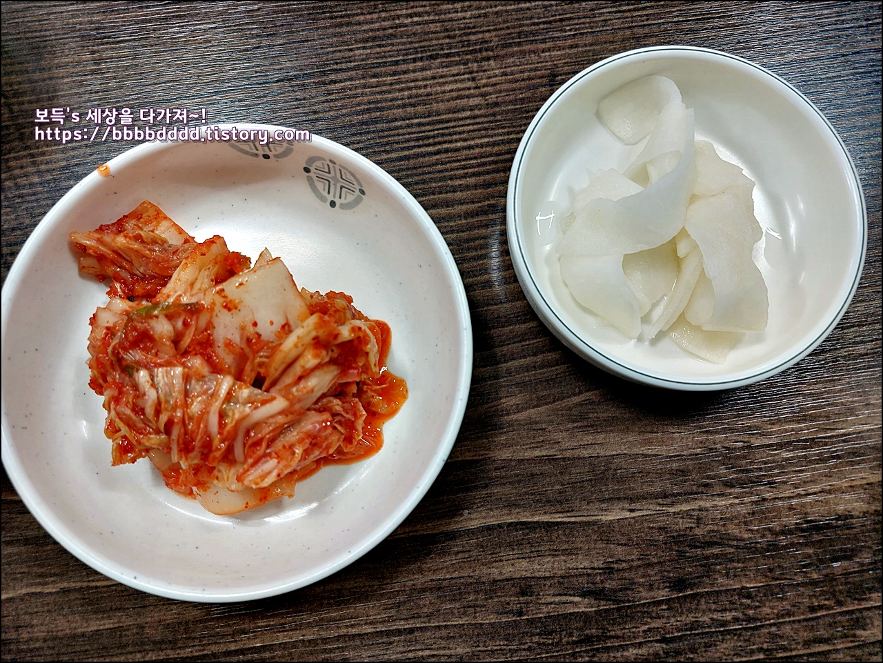 반찬으로 나오는 김치와 넙적 무채.