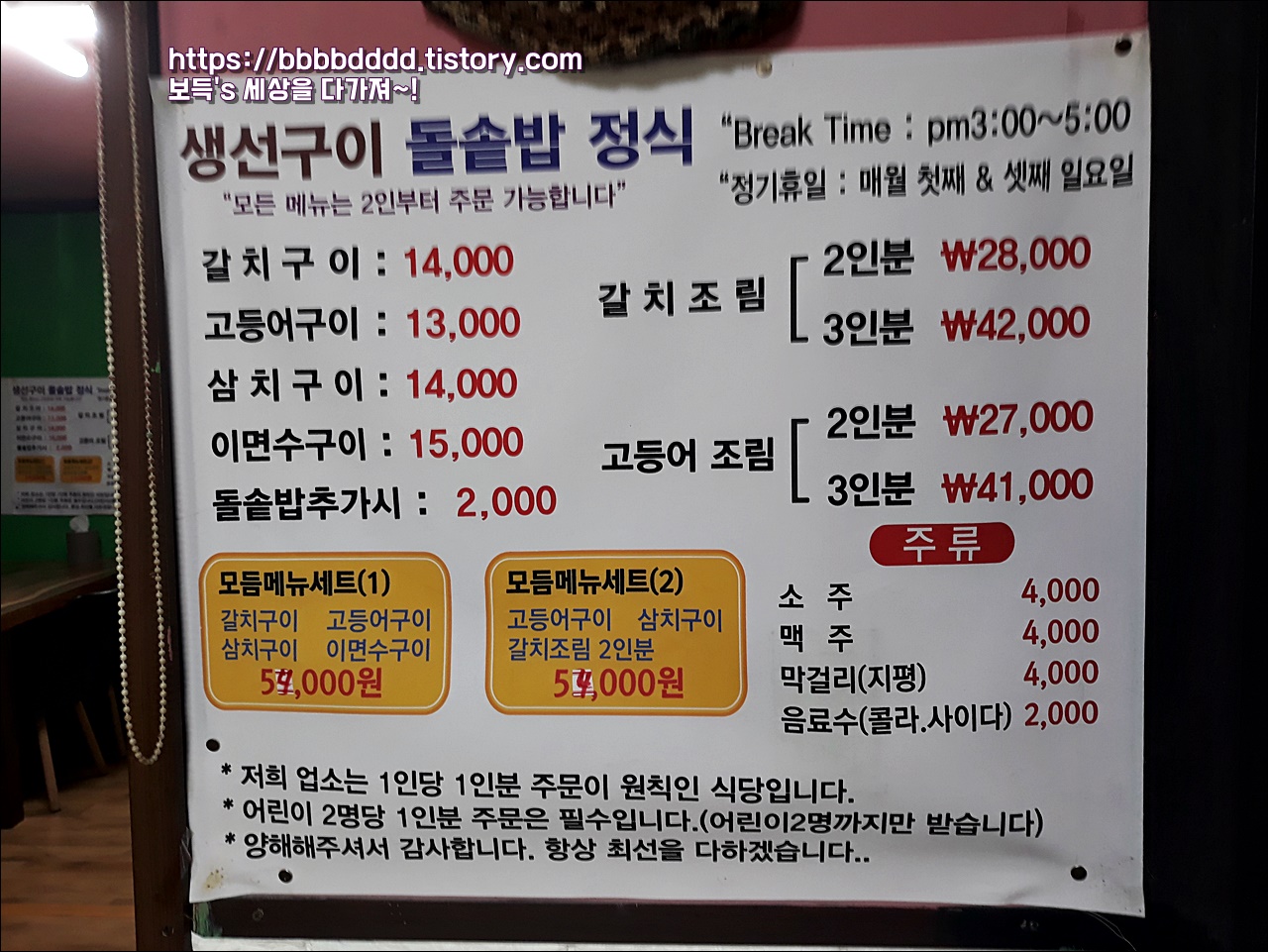 아궁이 생선구이의 메뉴다.
